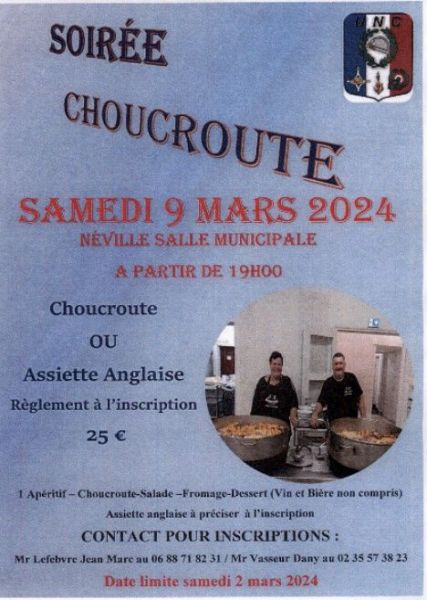 Soirée choucroute samedi 9 mars 2024 Organiser par les Anciens Combattants Néville